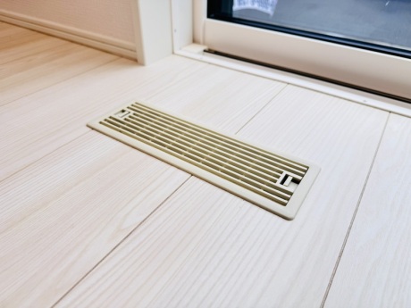 ※8号棟【空調・屋内換気部材】ルームガラリを採用。換気性能はもちろん、住まう人に優しいこだわり。室内との温度差が少なく、素足で踏んでもヒヤッとしづらい。床下メンテナンスにも優れモノです。※10/30撮影