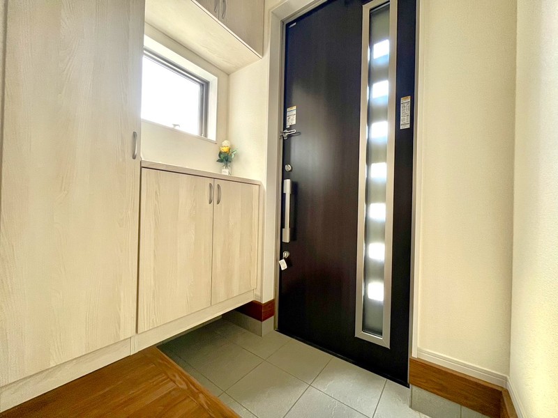【玄関】外出時や玄関周りで使用するものをまとめてスッキリと収納できるので、玄関スペースを広く使うことができます。お洒落な玄関ポーチはダウンライトで暗くなったご家族のお帰りをお迎えしてくれます。※施工例