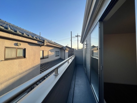 【バルコニー】バルコニーで季節モノや布団などの洗濯物も一気に干せますね♪2つの洋室から出入りできるバルコニーは使い勝手が良く、洗濯物やお布団を干すのもラクラクです。陽当たりも良好♪※施工例