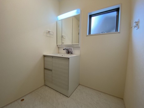 【洗面台】ゆとりの洗面スペースで朝の身支度も快適スムーズ。大きな三面鏡で髪のセットやお化粧も捗り、朝から気分良く通勤通学に向かえそう♪豊富な収納スペースのおかげで、空間を有効利用できます。※施工例