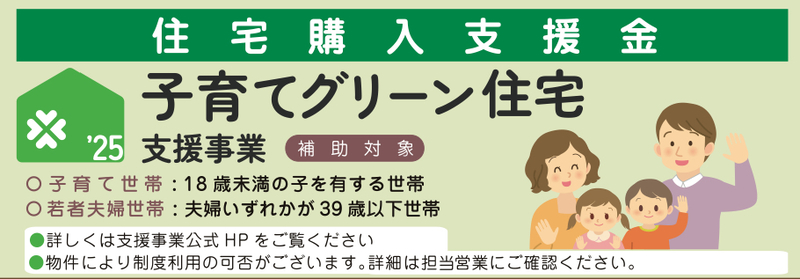子育てグリーン住宅支援事業対象物件です。条件によって補助金が出るので、詳しくは担当までご確認ください。