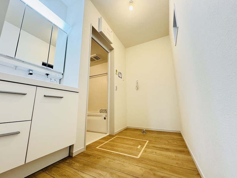【洗面台】忙しい朝に家事や身支度がはかどるシャワードレッサー。洗髪・洗面・化粧などができる機能と収納スペースを一体化。広々とした脱衣所でお支度もスムーズに。気持ちよく1日のスタートを♪※9/22撮影