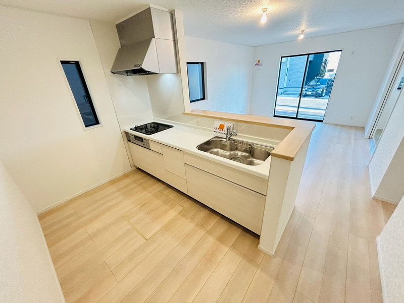 1号棟【キッチン】リビングで遊ぶお子様を見守りながらお料理が出来る対面式カウンターキッチンは、料理をしながらでも会話ができます。ご家族をいつも身近に感じられ、お料理も楽しくなりますね。※1/13撮影