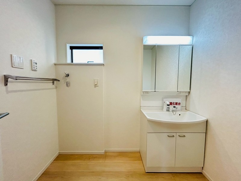 1号棟【洗面台】ゆとりの洗面スペースで朝の身支度も快適スムーズ。大きな三面鏡で髪のセットやお化粧も捗り、朝から気分良く通勤通学に向かえそう♪豊富な収納で、空間を有効利用できます。※1/13撮影