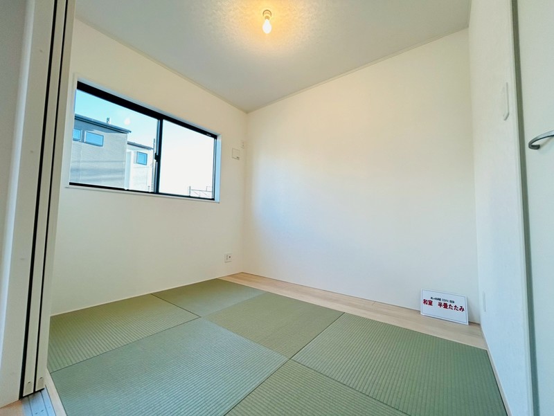 1号棟【和室】畳の香りに癒される空間の和室は、お昼寝処にはもちろん、家事スペースや客間、お子様のキッズスペースなど用途多彩です。休日には、家族で癒しの時間を過ごしてみませんか。※1/13撮影