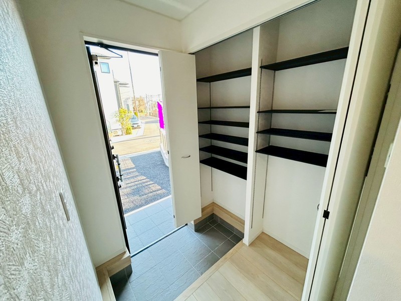 1号棟【玄関】散らかりがちな玄関もスッキリと保てる玄関収納は、家の中に入る時一番最初に目に付く場所だからこだわりたいですよね!落ち着いた雰囲気が、お部屋の雰囲気をそのまま表しています。※1/13撮影
