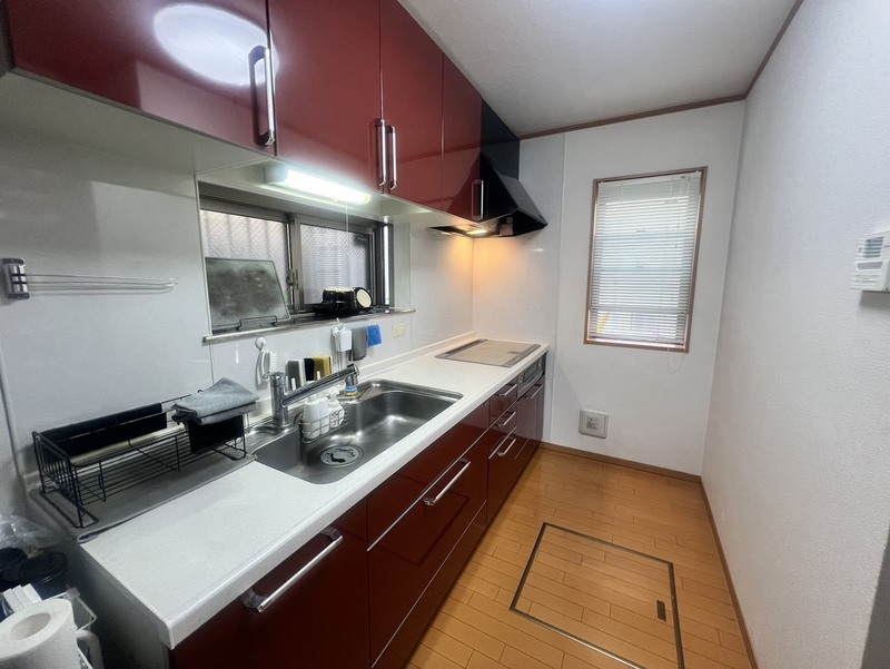 ◆キッチンは高級感あふれるワインレッドが目を引きます♪パスタ鍋や圧力鍋、フライパンなど収納いただけます♪