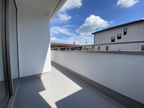 【バルコニー】主寝室から出入りできる勝手の良いバルコニー。人数の多いご家庭でも、これだけ広ければ一度にまとめて干せるため手間もかからなさそうですね。※施工例