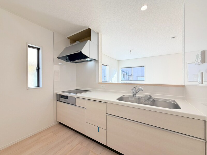 【キッチン】システムキッチン。圧力鍋やフライパンなども収納でき、出し入れがスムーズです。収納が豊富で、料理器具や調味料などの細かなものも取りやすく、ご家族と一緒にお料理を楽しめます。※施工例