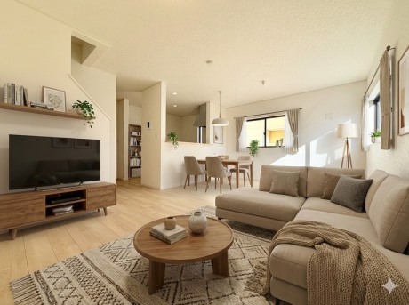 【2階リビング】心地よい風を感じ、空の眺めを楽しめる2階のリビング。周辺からの視線も気になりません。窓からの明るい日差しがリビングの隅々まで届きます!(家具等はCGです)※施工例