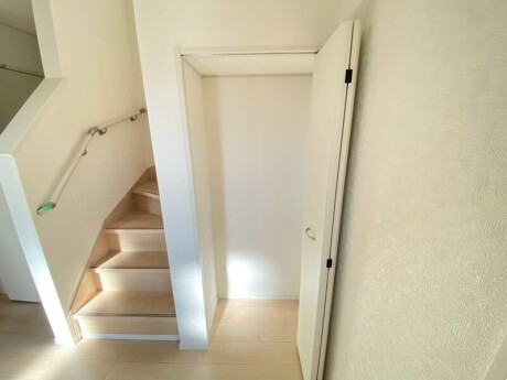 【1階廊下の便利な収納】家族共有の収納場所として、扇風機などの季節物の家電や生活用品のストック等を収納できます。折れ戸式のドアなので、廊下と行き交う家族もスペースに余裕を持って移動できます。※施工例
